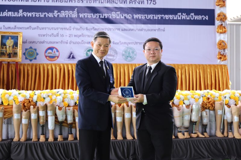 วันที่ 21 พฤศจิกายน 2568 ศาสตราจารย์เกียรติคุณ นายแพทย์เกษม วัฒนชัย องคมนตรี และประธานกรรมการมูลนิธิขาเทียม ในสมเด็จพระศรีนครินทราบรมราชชนนี เป็นประธานในพิธีมอบขาเทียมพระราชทานแก่คนพิการขาขาดในจังหวัดสมุทรปราการและพื้นที่ใกล้เคียง ตามโครงการออกหน่วยทำขาเทียมพระราชทานเคลื่อนที่ ครั้งที่ 175 โดยมีศาสตราจารย์คลินิก นายแพทย์นิเวศน์ นันทจิต เลขาธิการมูลนิธิขาเทียมฯ กล่าวรายงานผลการปฏิบัติงานออกหน่วยทำขาเทียม นายศุภมิตร ชิณศรี ผู้ว่าราชการจังหวัดสมุทรปราการ กล่าวขอบคุณผู้สนับสนุนโครงการและแสดงความยินดีกับคนพิการขาขาด
